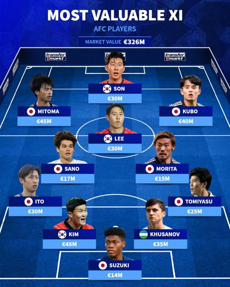 亚洲德转身价最高阵:孙兴慜、三笘薫、胡桑诺夫在列,日本占7席