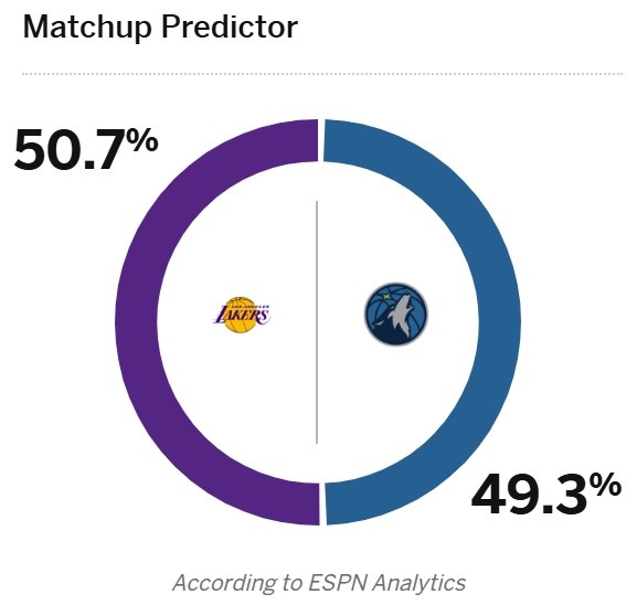 湖人1-2落后!ESPN预测G4胜率:湖人50.7%略占优势 森林狼49.3% 来源:24直播网 发布日期:2025-04-27 08:30 4月26日讯 NBA季后赛首轮G3,森林狼主场116-104力擒湖人。ESPN更新了两支球队G4的胜率,其中湖人50.7%略占优势,森林狼49.3%。湖人和森林狼的G4将在后天凌晨3点30开打。