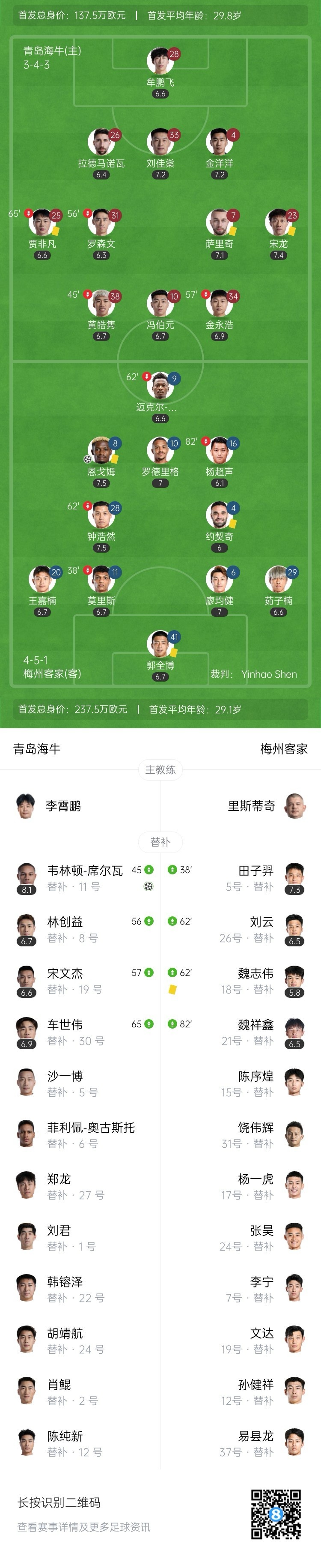 全场比赛结束,青岛海牛1-1战平梅州客家。
